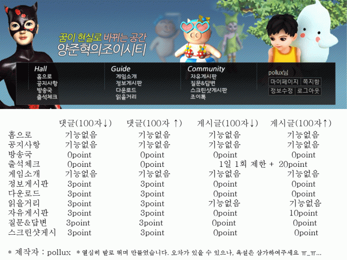 아참고로 댓글은 게시판 1페이지 있는 글들만 돈오르니 명심하세요 ㅋㅋ 다른 페이지 넘어가면 돈안올라요;